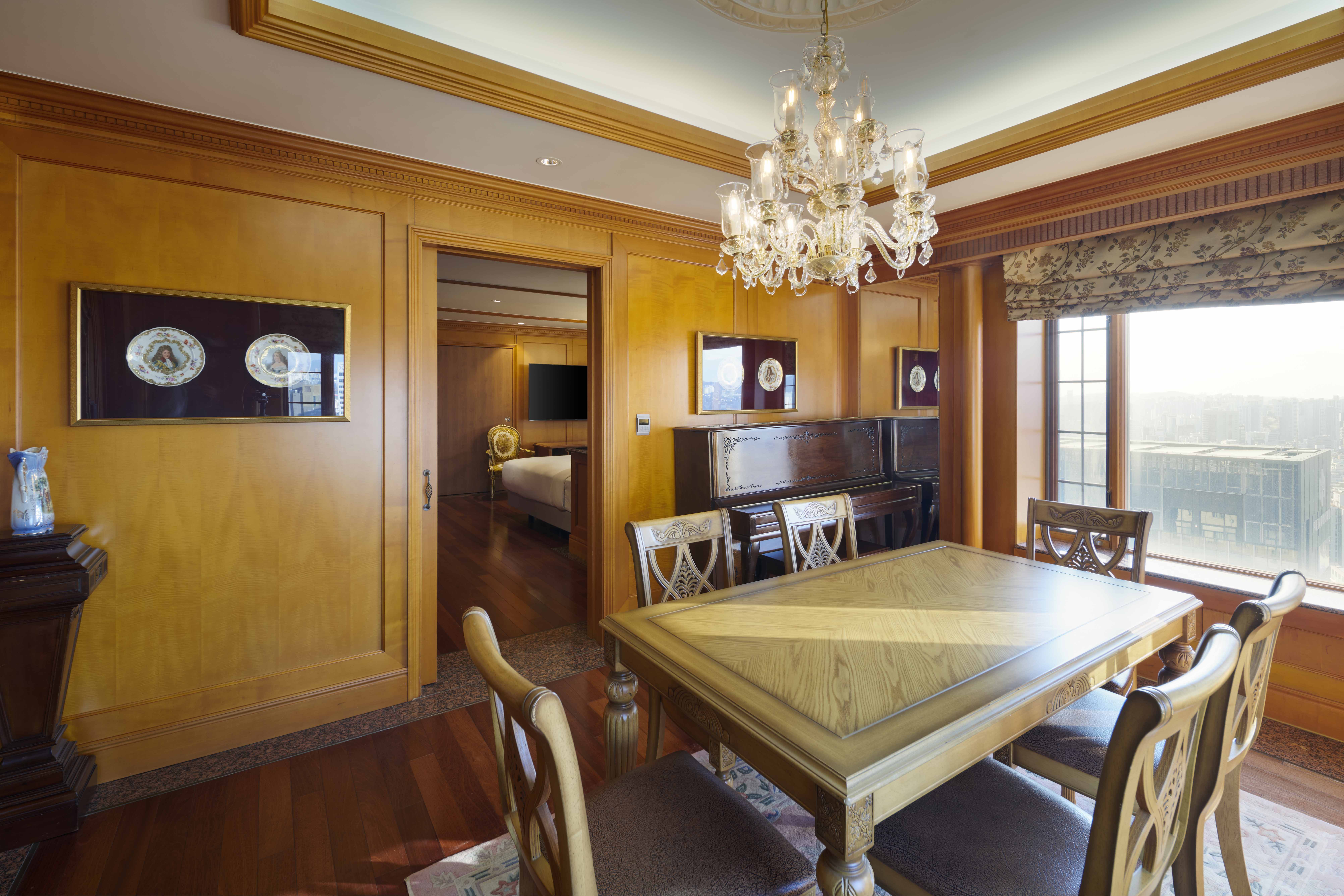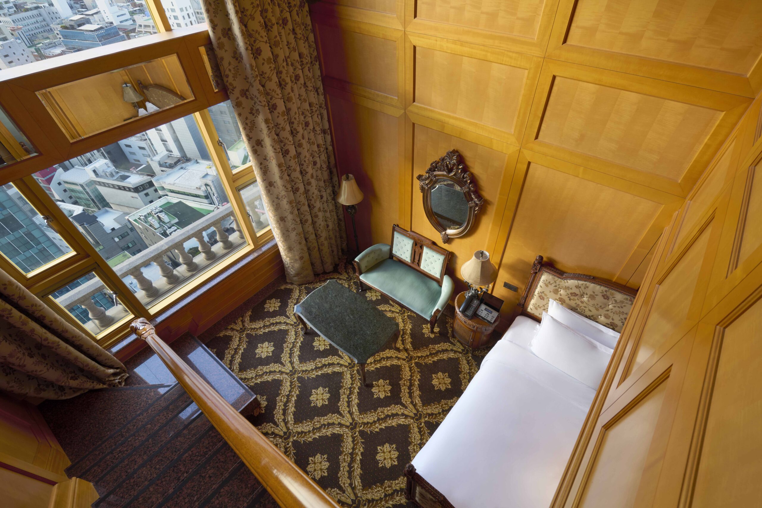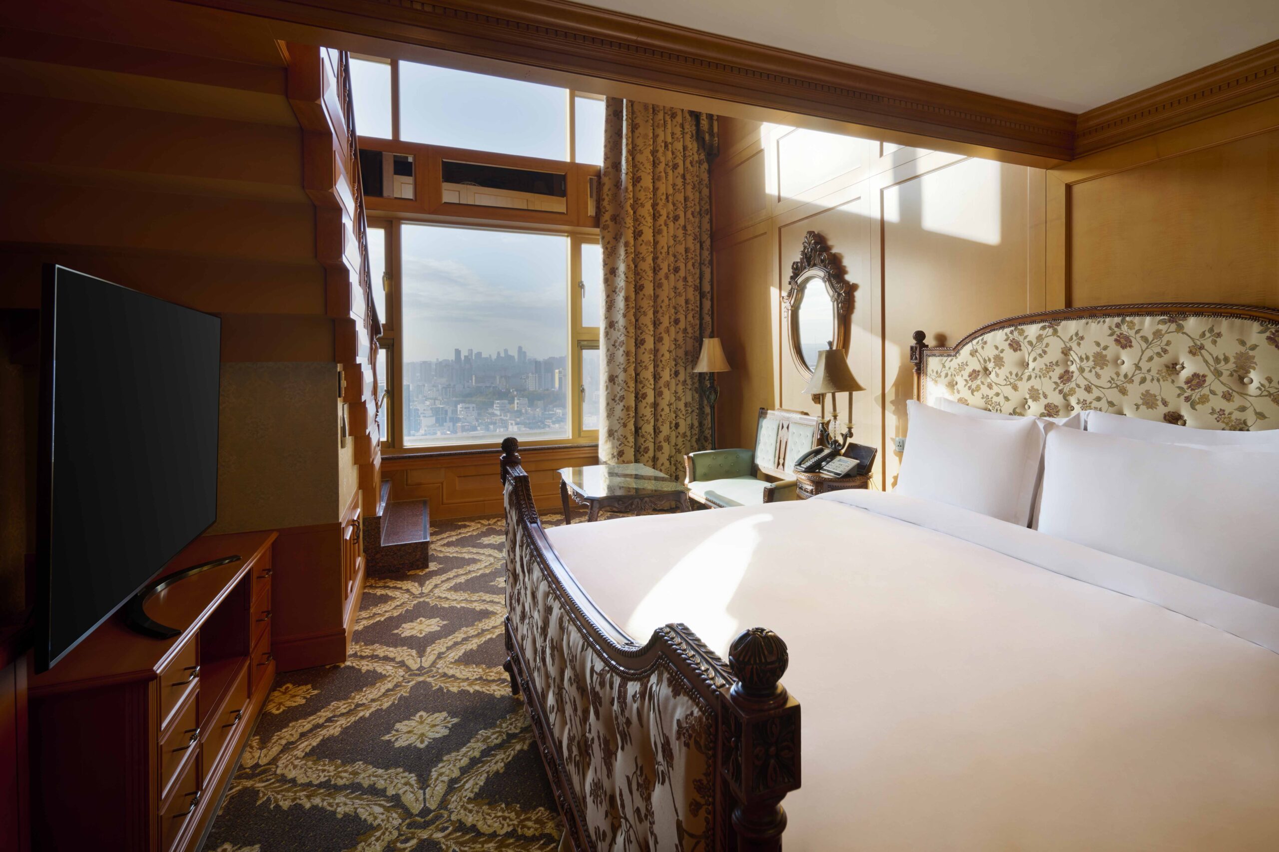 The suite showcases antique-inspired interiors and offers expansive high-floor skyline views of Gangnam, creating a truly elevated stay.