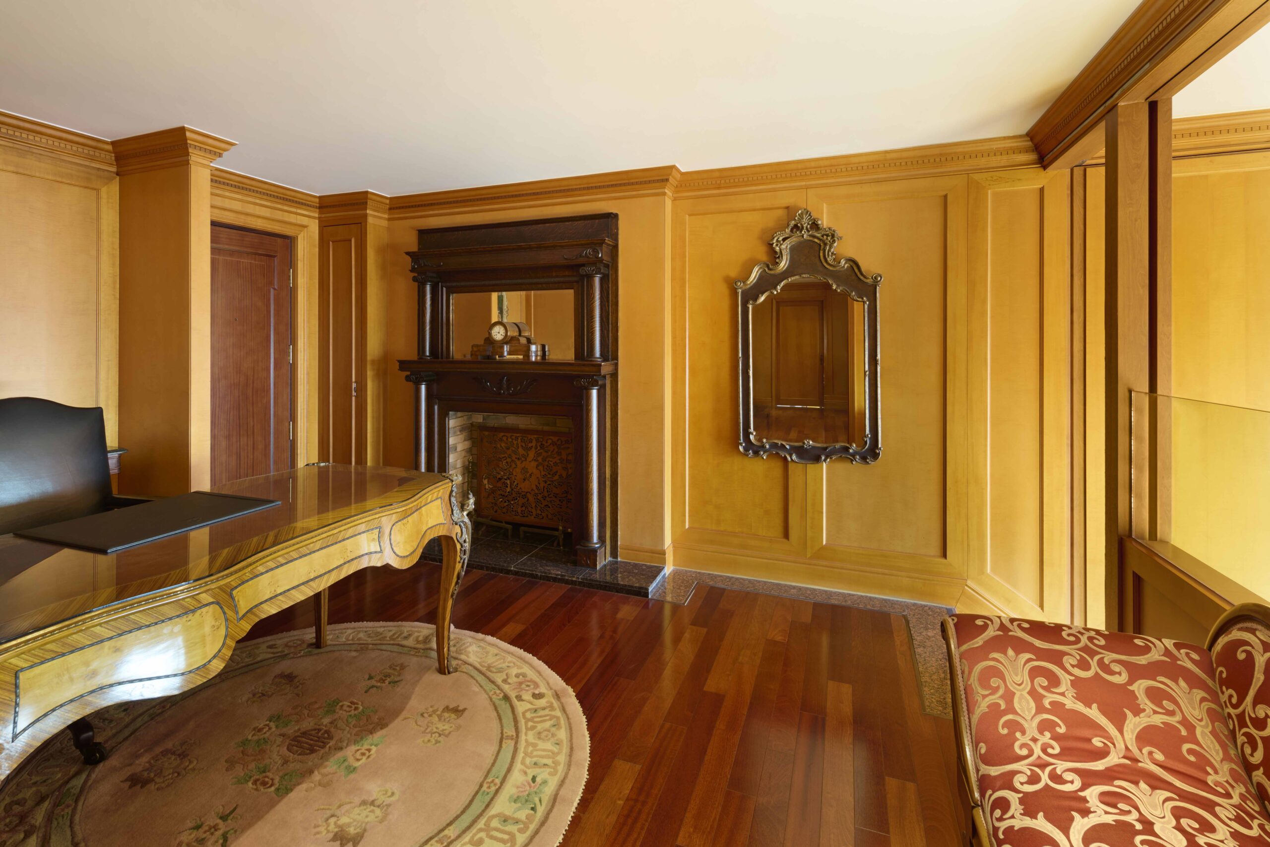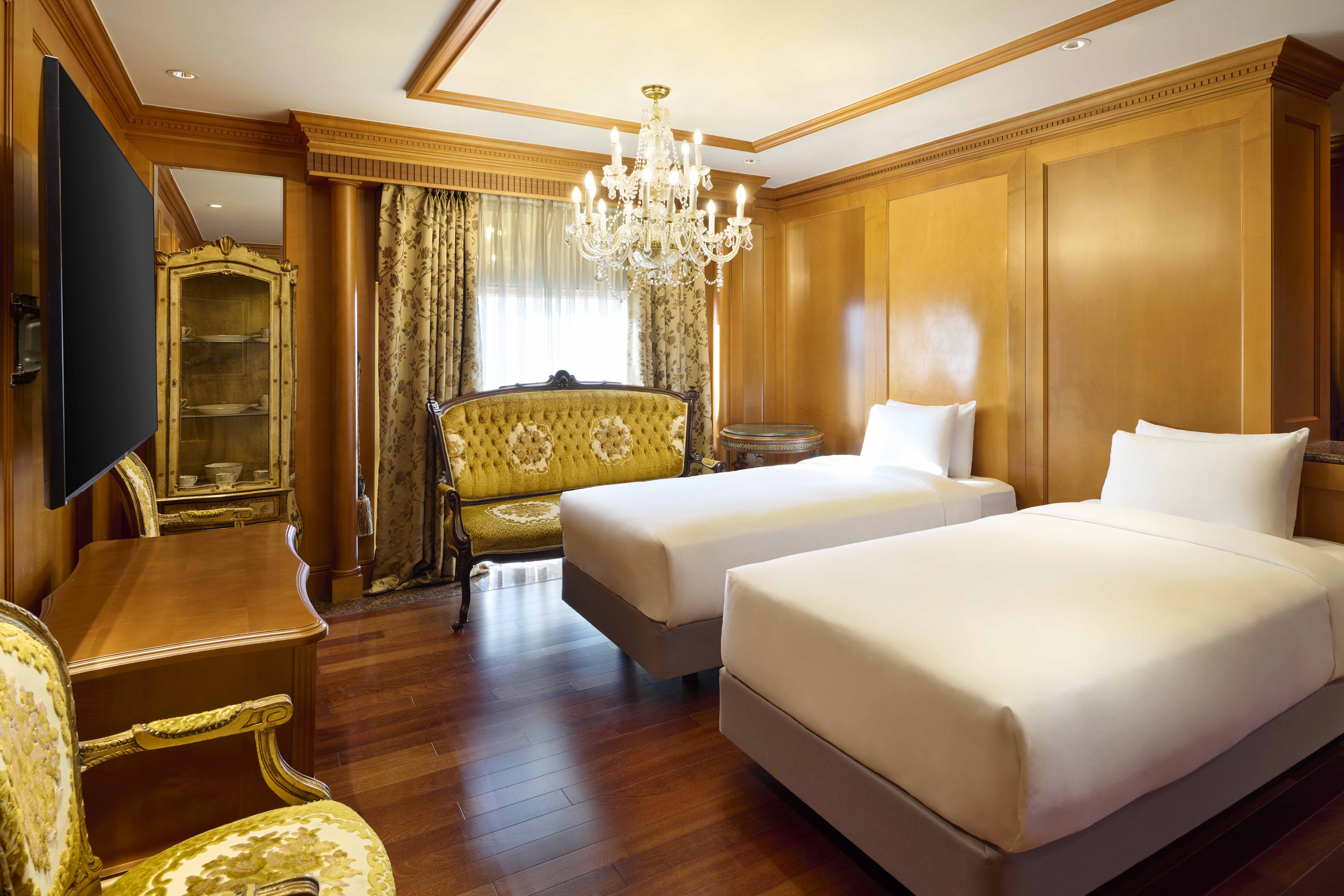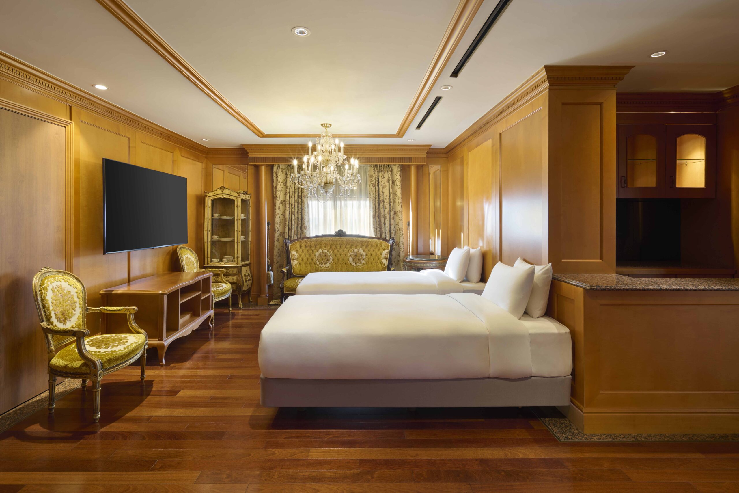 The suite showcases antique-inspired interiors and offers expansive high-floor skyline views of Gangnam, creating a truly elevated stay.
