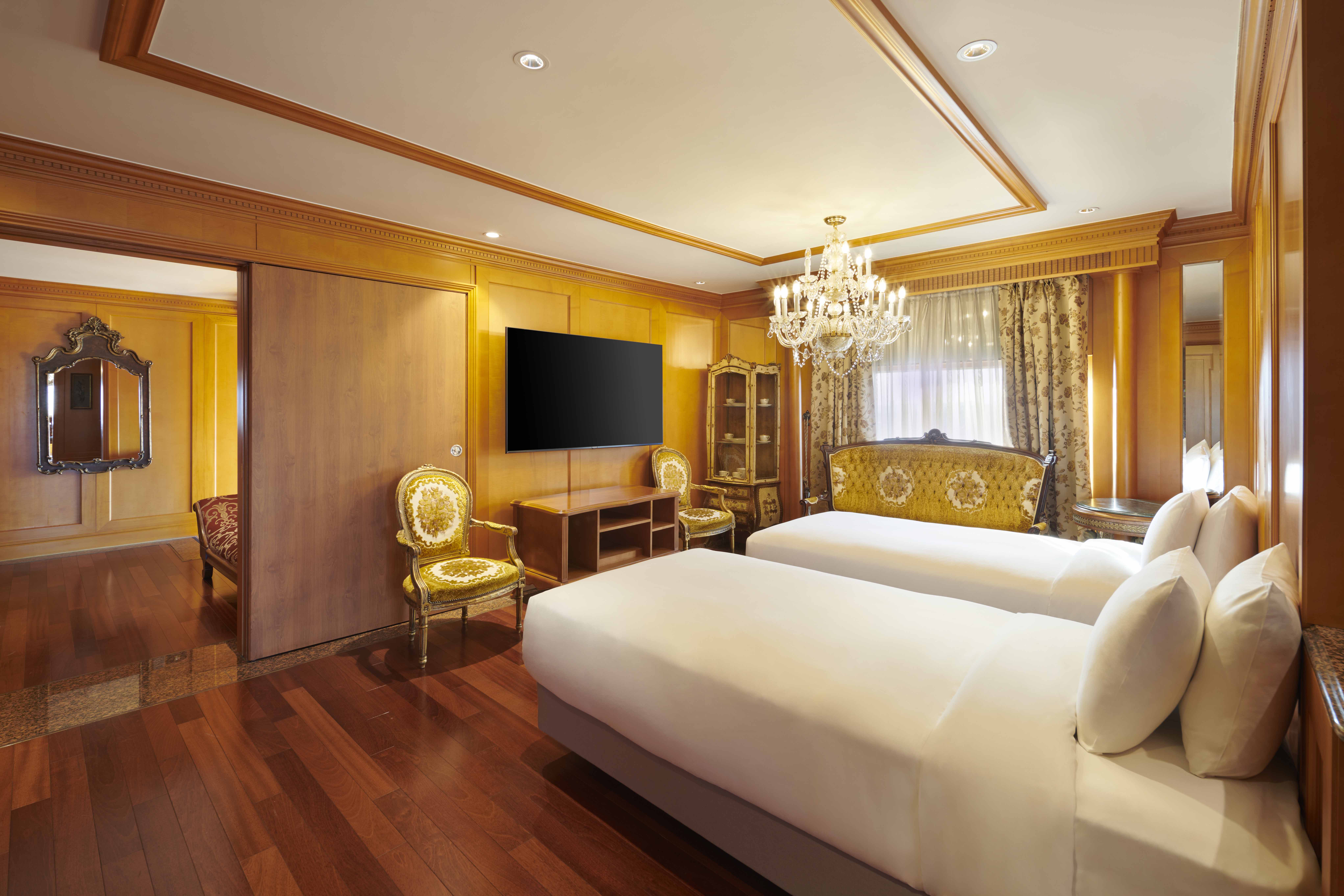 This signature suite—the second largest in the hotel—features an elegant duplex layout and comfortably accommodates up to four guests with its super king-size bed (200x210cm) and two single beds (100x200cm).
