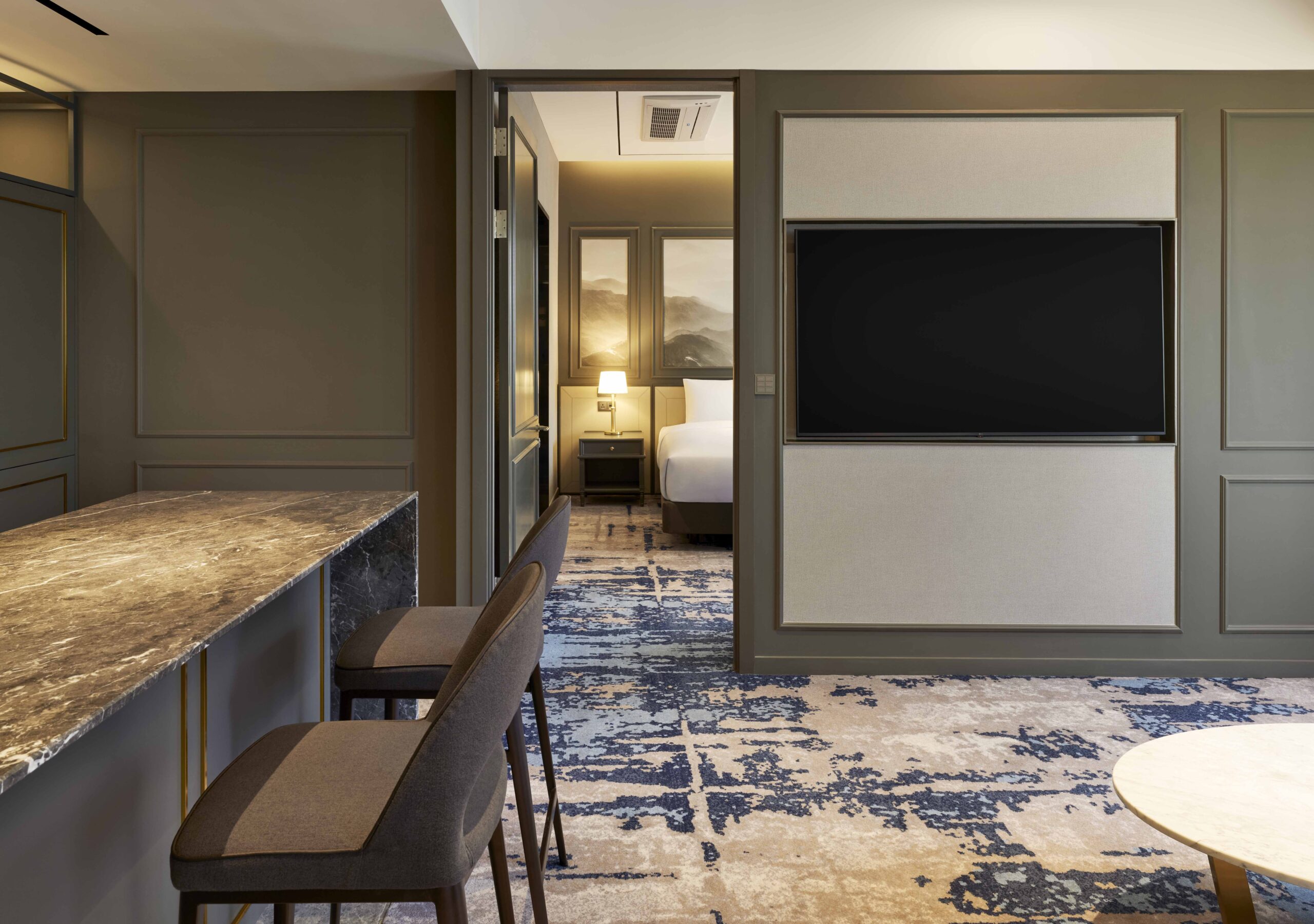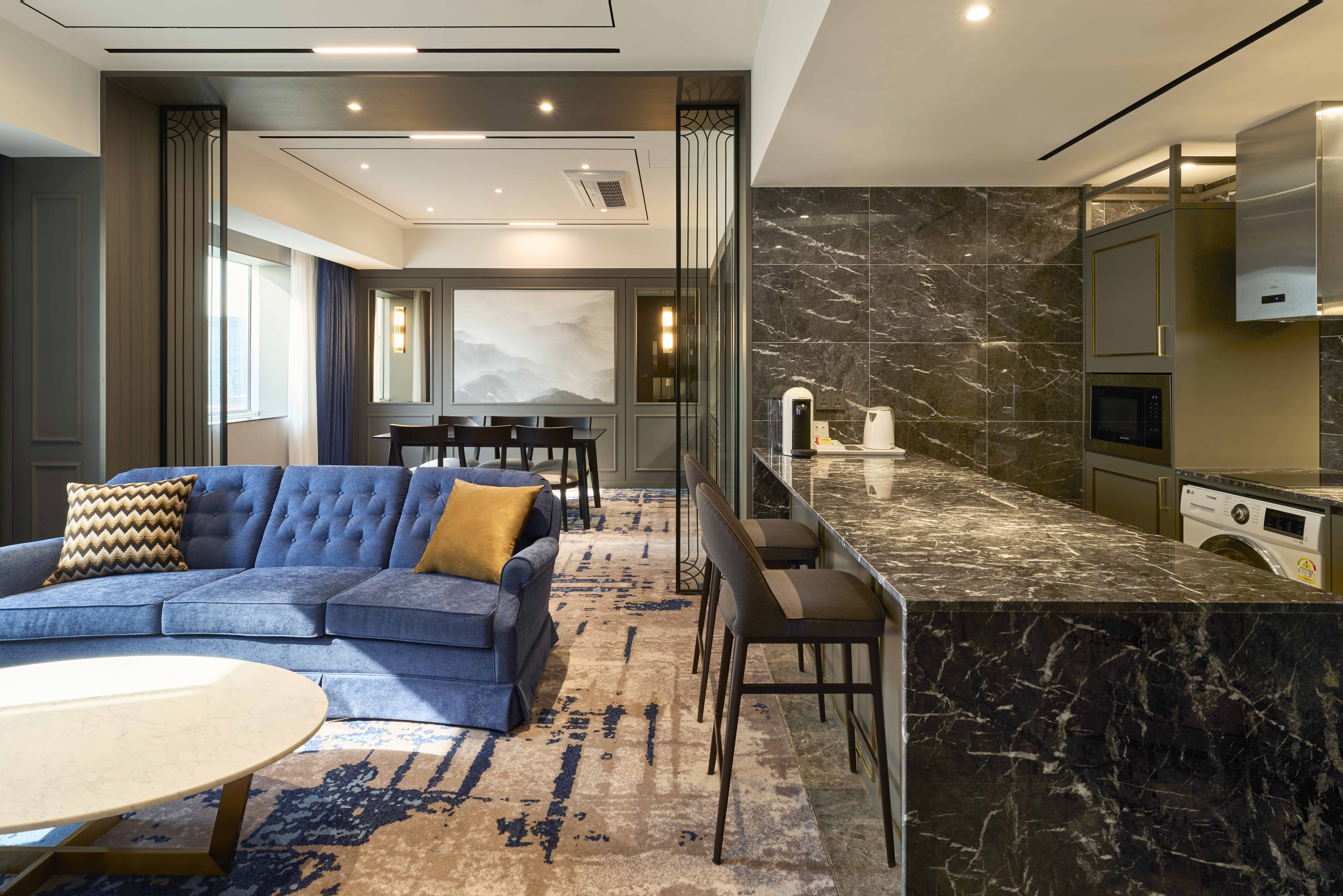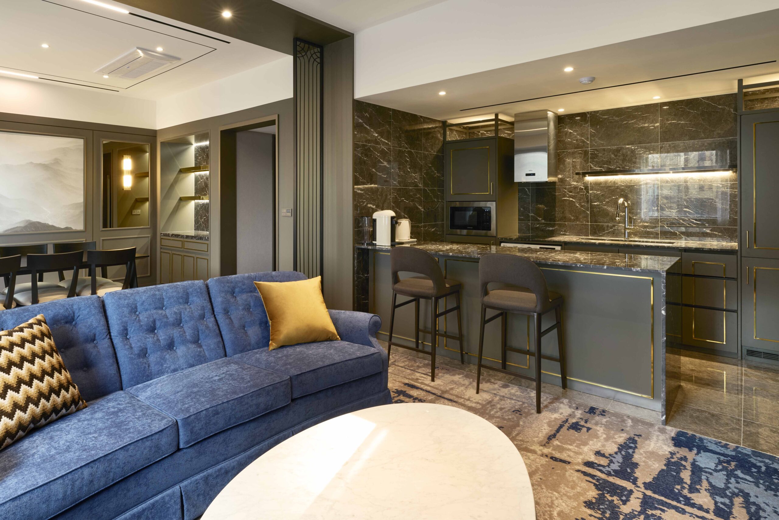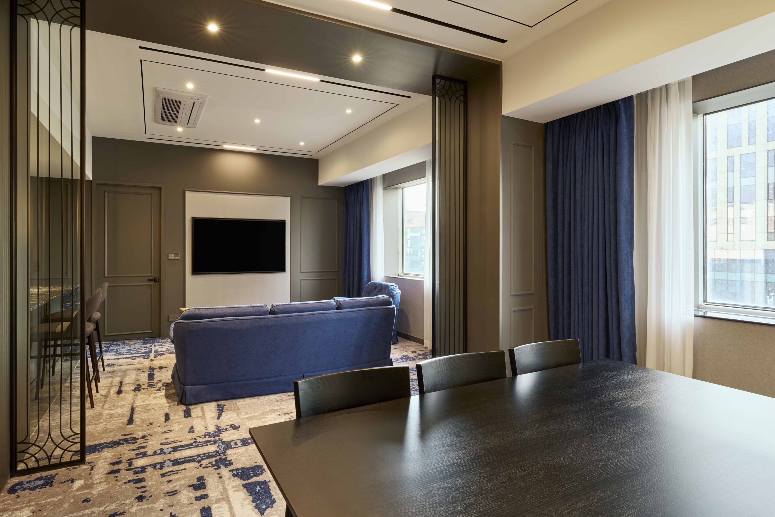 Experience a recently renovated, apartment-style room featuring a separate bedroom with a king-size bed (180x200cm), a stylish dining area with a table and six chairs, a cozy sofa for relaxing, a fully equipped kitchen with a washing machine, a spacious bathroom with both a bathtub and a shower, and a convenient clothing care system (Styler). Perfect for extended stays, this well-appointed space combines residential comfort with hotel-level convenience. Guests enjoy complimentary access to a traditional Korean-style sauna, and a minibar is provided free of charge on the first night of your stay.