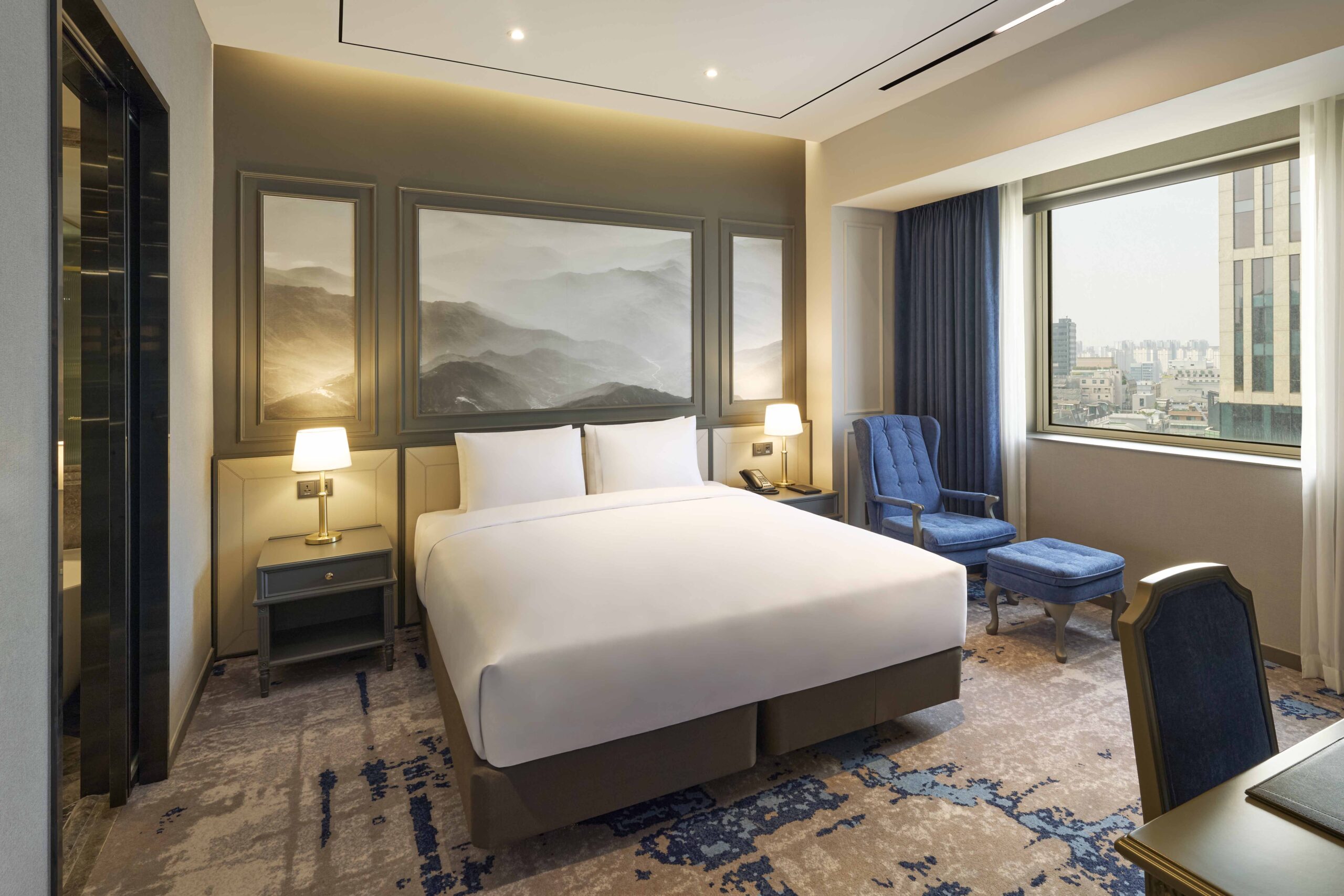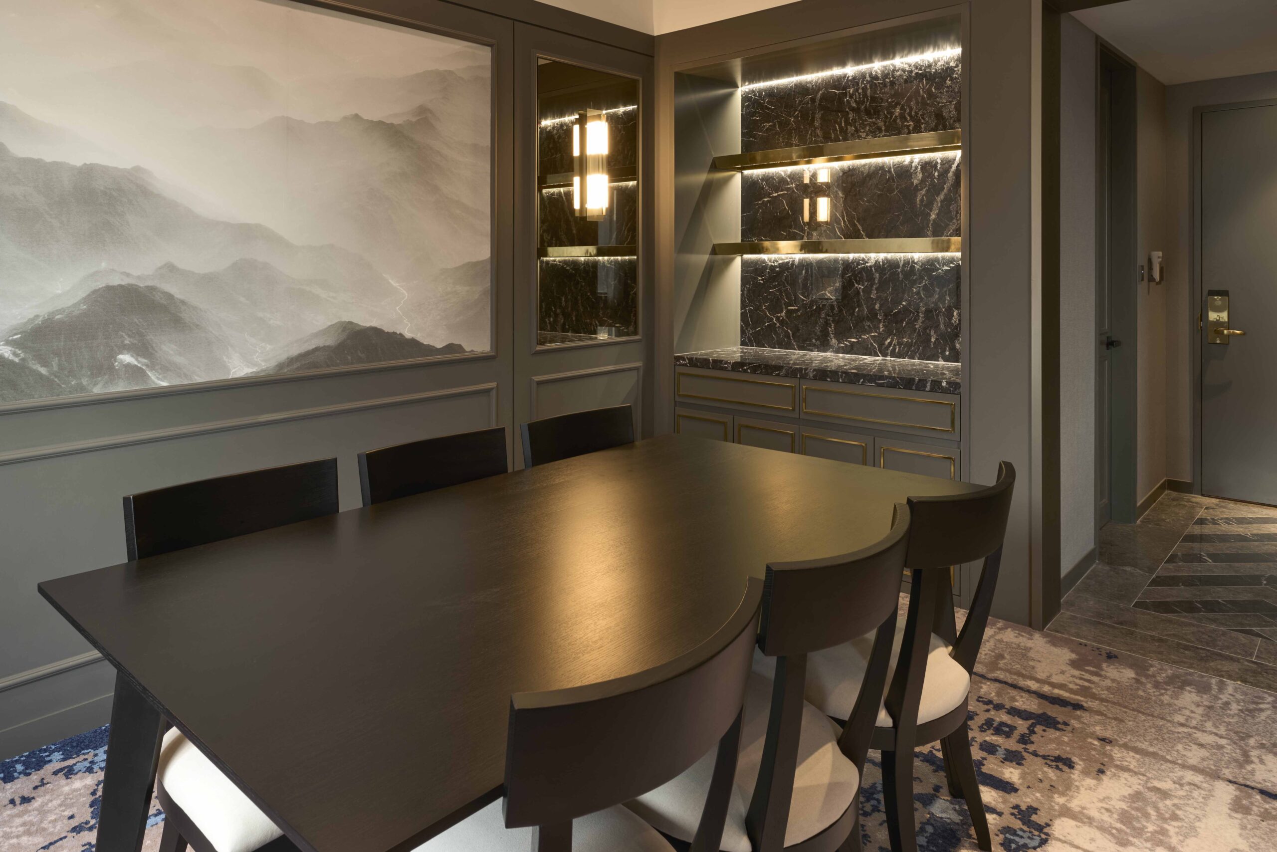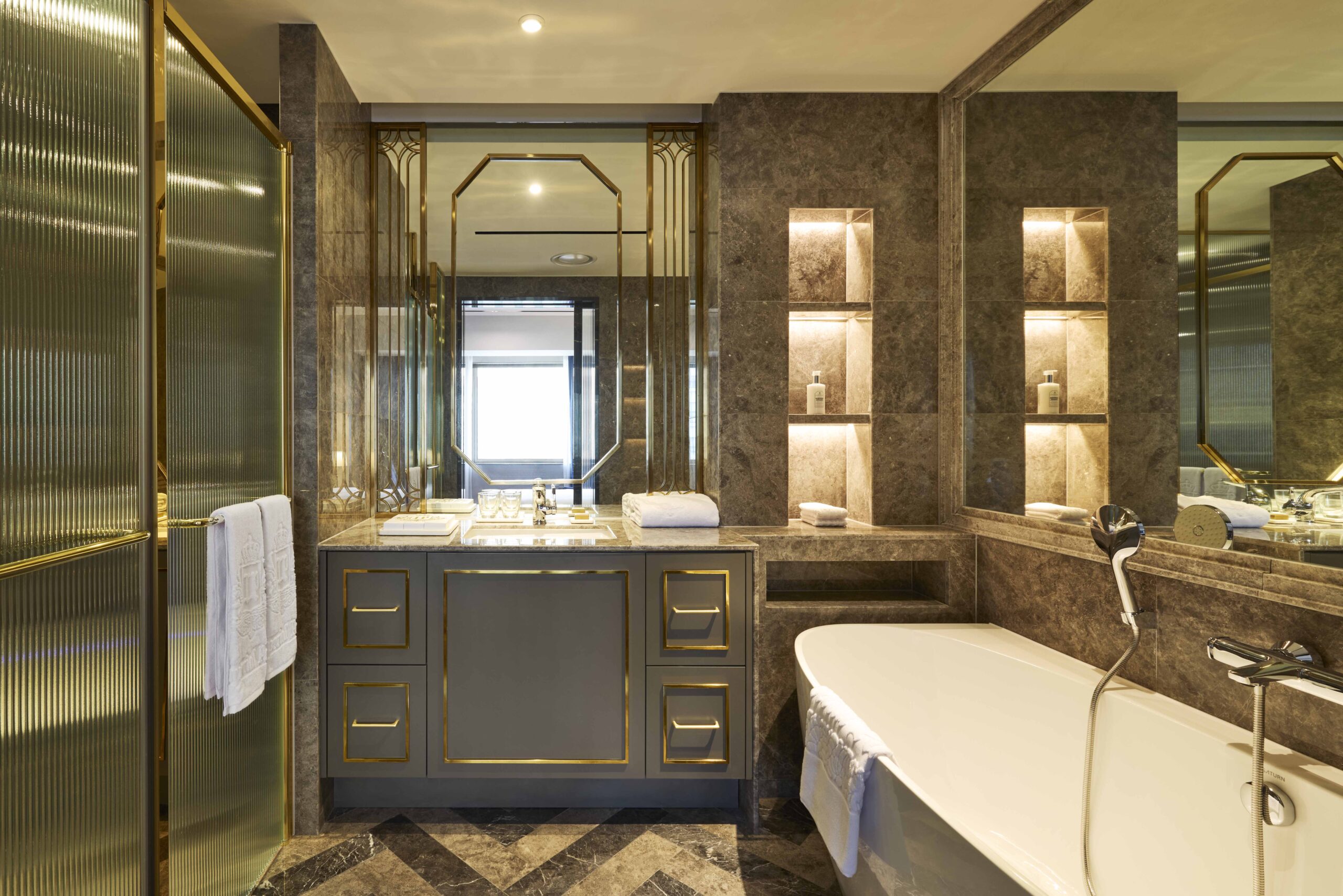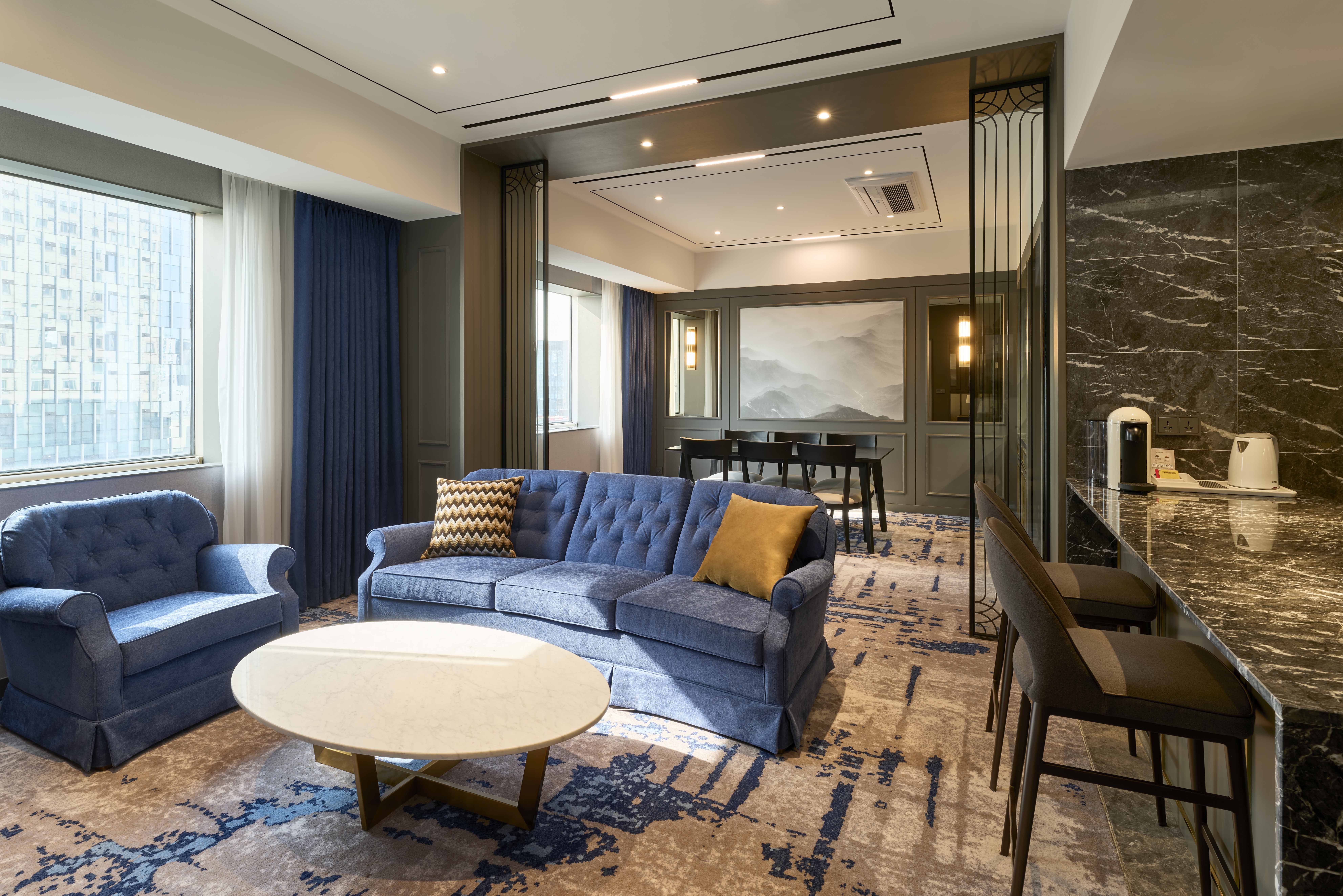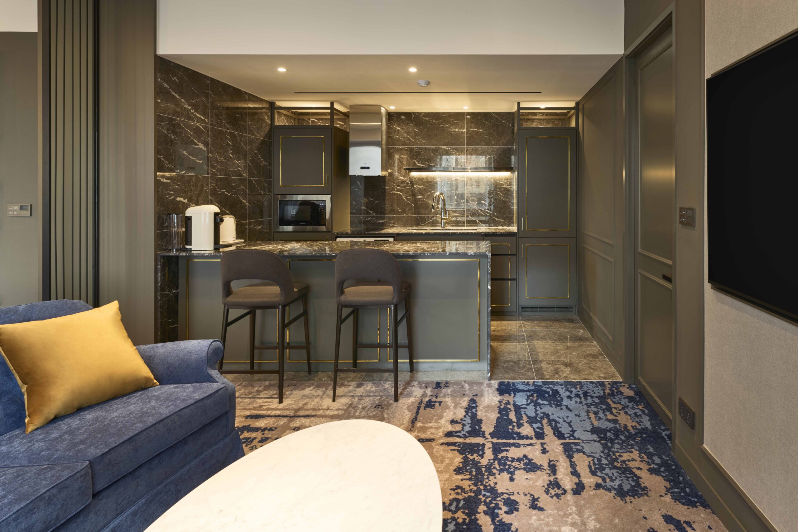 Experience a recently renovated, apartment-style room featuring a separate bedroom with a king-size bed (180x200cm), a stylish dining area with a table and six chairs, a cozy sofa for relaxing, a fully equipped kitchen with a washing machine, a spacious bathroom with both a bathtub and a shower, and a convenient clothing care system (Styler). Perfect for extended stays, this well-appointed space combines residential comfort with hotel-level convenience. Guests enjoy complimentary access to a traditional Korean-style sauna, and a minibar is provided free of charge on the first night of your stay.
