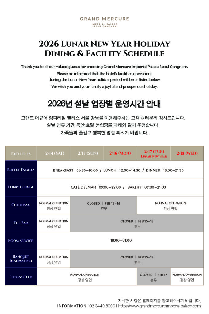 Thank you to all our valued guests for choosing Grand Mercure Imperial Palace Seoul Gangnam.